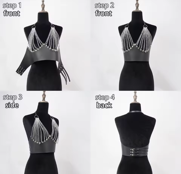 • Materiale durabile: Deși nu voi detalia abrevierea, produsul este fabricat din materiale de calitate, care urmăresc să fie sigure pentru piele. Materialul principal este, de obicei, din piele eco sau PVC de calitate/ecopielă, iar garniturile metalice (lanțuri, buckles) sunt de obicei din aliaje de zinc sau oțel, rezistente la coroziune.