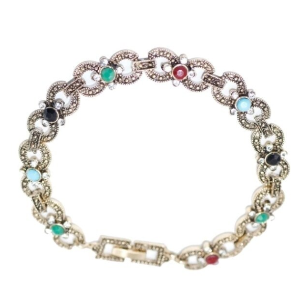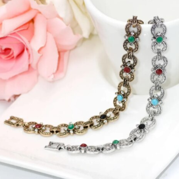 Aceasta bratara eleganta impresioneaza prin designul floral clasic, completat de cristale stralucitoare si detalii colorate discrete. Fiecare element decorativ este atent finisat pentru un aspect sofisticat si feminin. Sistemul de inchidere este sigur si usor de utilizat, iar lungimea de 18 cm o face potrivita pentru majoritatea incheieturilor.