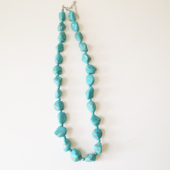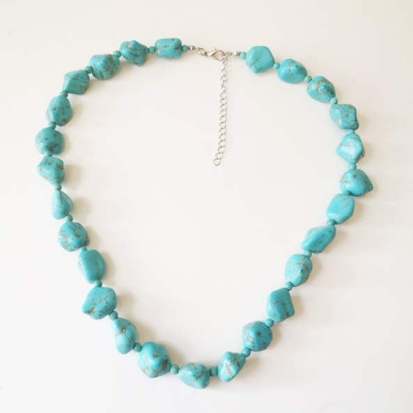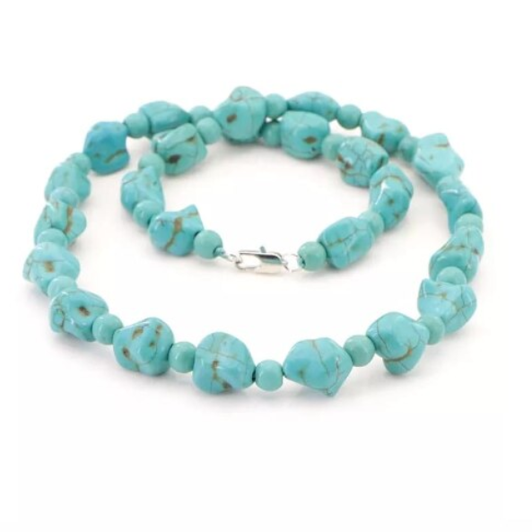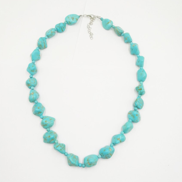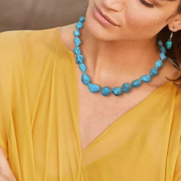 Colierul pentru dama cu pietre turcoaz este un accesoriu versatil, inspirat din stilul natural si boho. Pietrele decorative cu forma neregulata ofera un aspect autentic si elegant, usor de asortat cu diverse tinute.