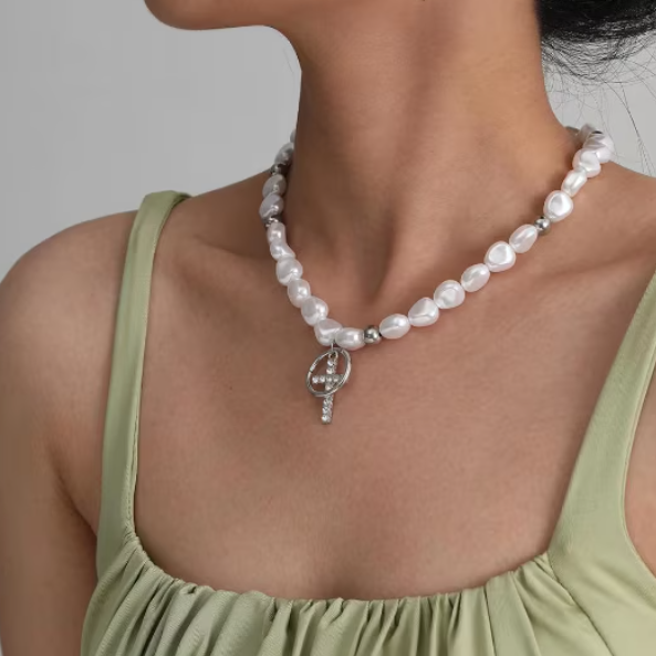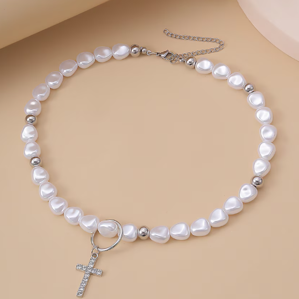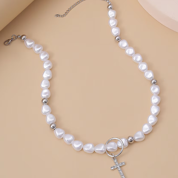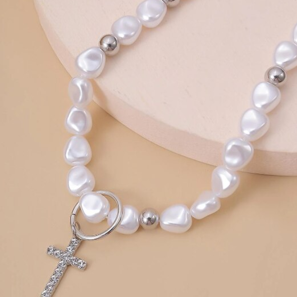 Colier stil Hip Hop cu cruciulita decorativa, finisaj alb-argintiu si design modern, ideal pentru tinute urbane, streetwear sau cadou cu personalitate.