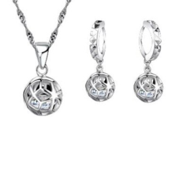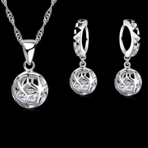 Set elegant de bijuterii compus din colier si cercei, finisaj argintiu si design rotund cu detalii stralucitoare, ideal pentru tinute rafinate.