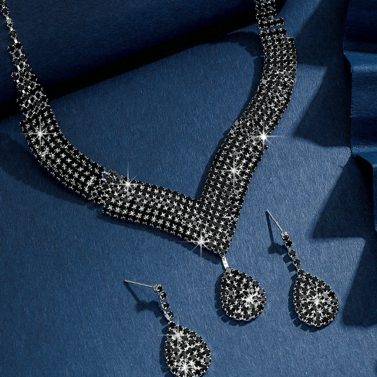 Set dama format din colier si cercei, realizat din aliaj metalic cu finisaj negru, decorat integral cu cristale negre stralucitoare.