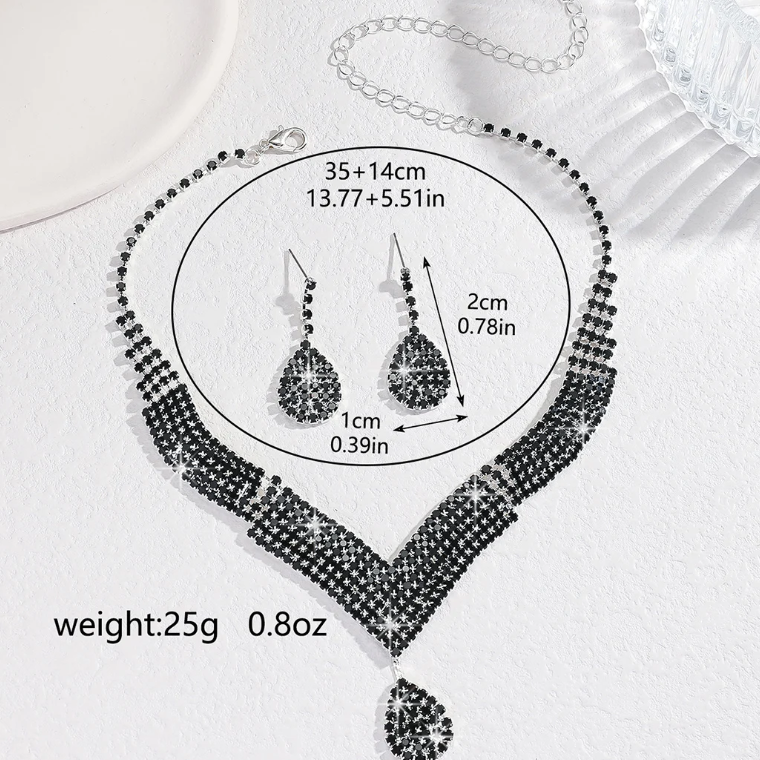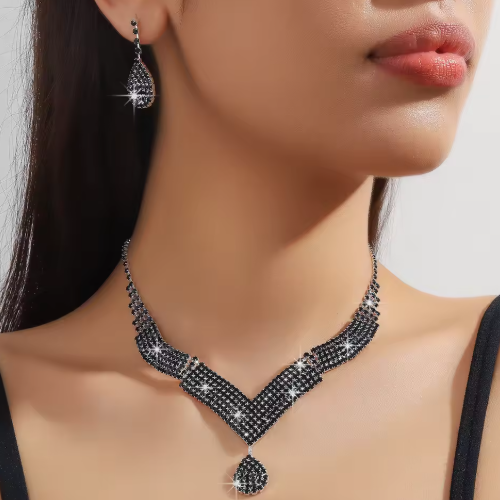 Set colier si cercei dama cu cristale negre stralucitoare, model V cu pandantiv lacrima, elegant si modern, ideal pentru tinute de seara, evenimente, petreceri si ocazii speciale.
