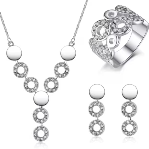 Setul de bijuterii pentru fete este creat special pentru a aduce un plus de stralucire si bucurie celor tinere. Compus din colier, cercei si inel asortat, setul are un design delicat si finisaj argintiu, potrivit pentru purtare zilnica sau ocazii speciale. Accesoriile sunt usoare, confortabile si usor de asortat, fiind ideale pentru cadouri sau evenimente festive.